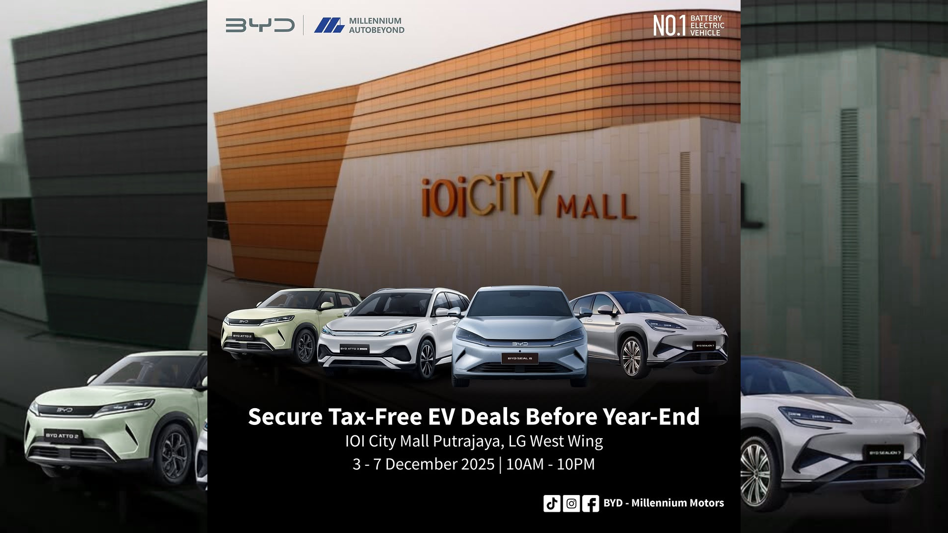 Putrajaya, El Sky News – BYD Millennium Motors is set to launch one of Malaysia’s most anticipated electric vehicle events of the year. From 3 to 7 December 2025, the brand will take over the LG West Wing of IOI City Mall Putrajaya to present its full range of award-winning electric vehicles. The event will highlight exclusive tax-free EV deals, making it the perfect moment for Malaysians to explore eco-friendly mobility options before year-end.