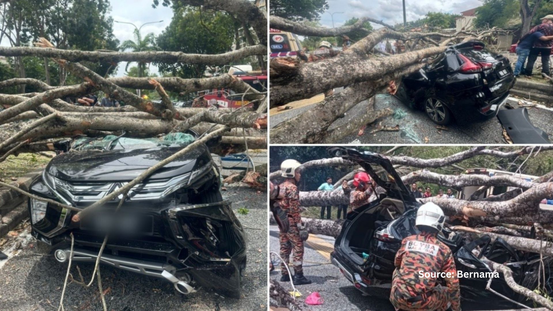 The incident occurred along Persiaran Tun Arshad Ayub, a busy stretch near an apartment complex. A mature tree reportedly uprooted and collapsed directly onto a moving Mitsubishi Xpander. The victims, identified as two female lecturers from Universiti Teknologi MARA (UiTM) Shah Alam, were trapped in the wreckage before being rescued and treated for injuries.